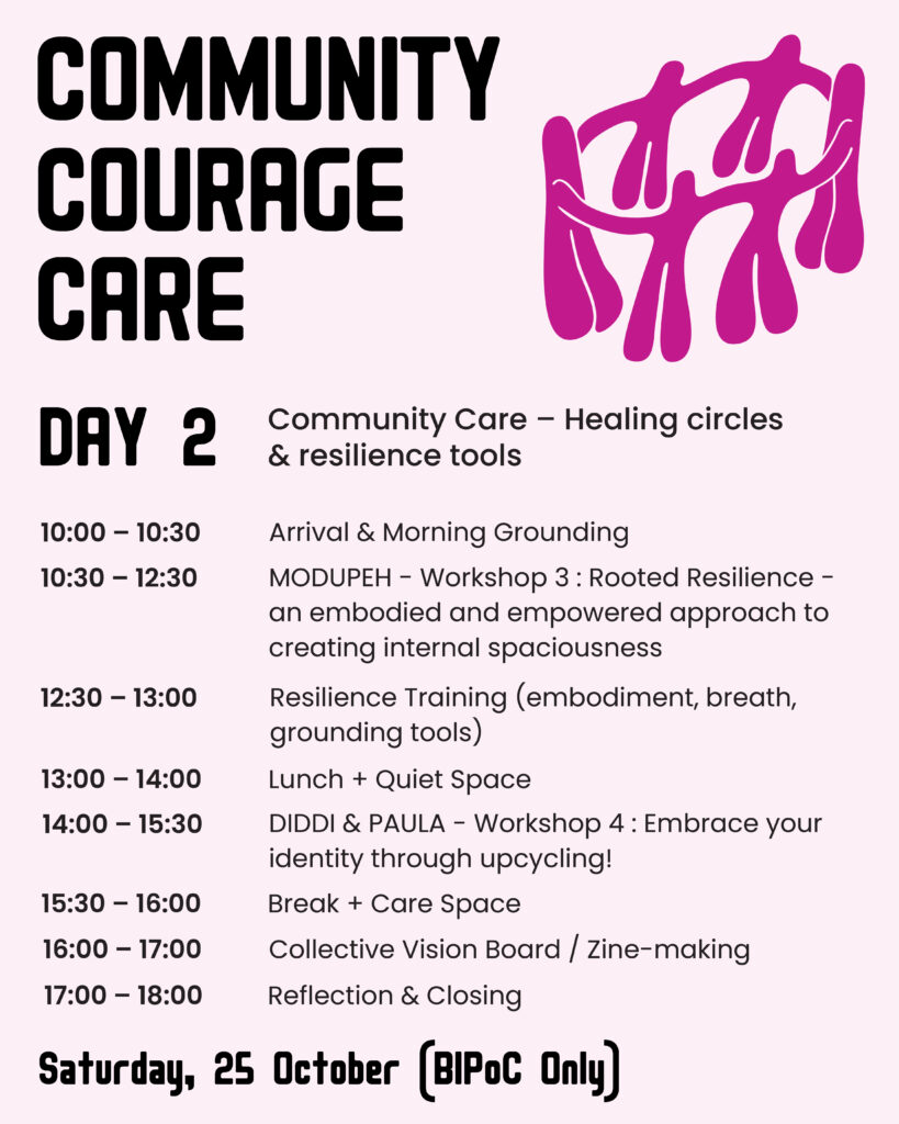 3 C’s is a 3-day community resilience cohort created by BIWOC* Rising centering queer BIPoC folks living at the intersections of racialized, gendered, and structural marginalization. This is a space for grounding, healing, skill-sharing, and collective dreaming—designed for us, by us.