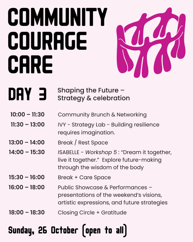 Over three days, 30 – 60 participants will engage in workshops and creative sessions that focus on legal empowerment, trauma-informed care, collective strategy, and artistic expression. We’ll close the weekend with a public brunch and showcase, celebrating the visions and stories we’ve cultivated together.