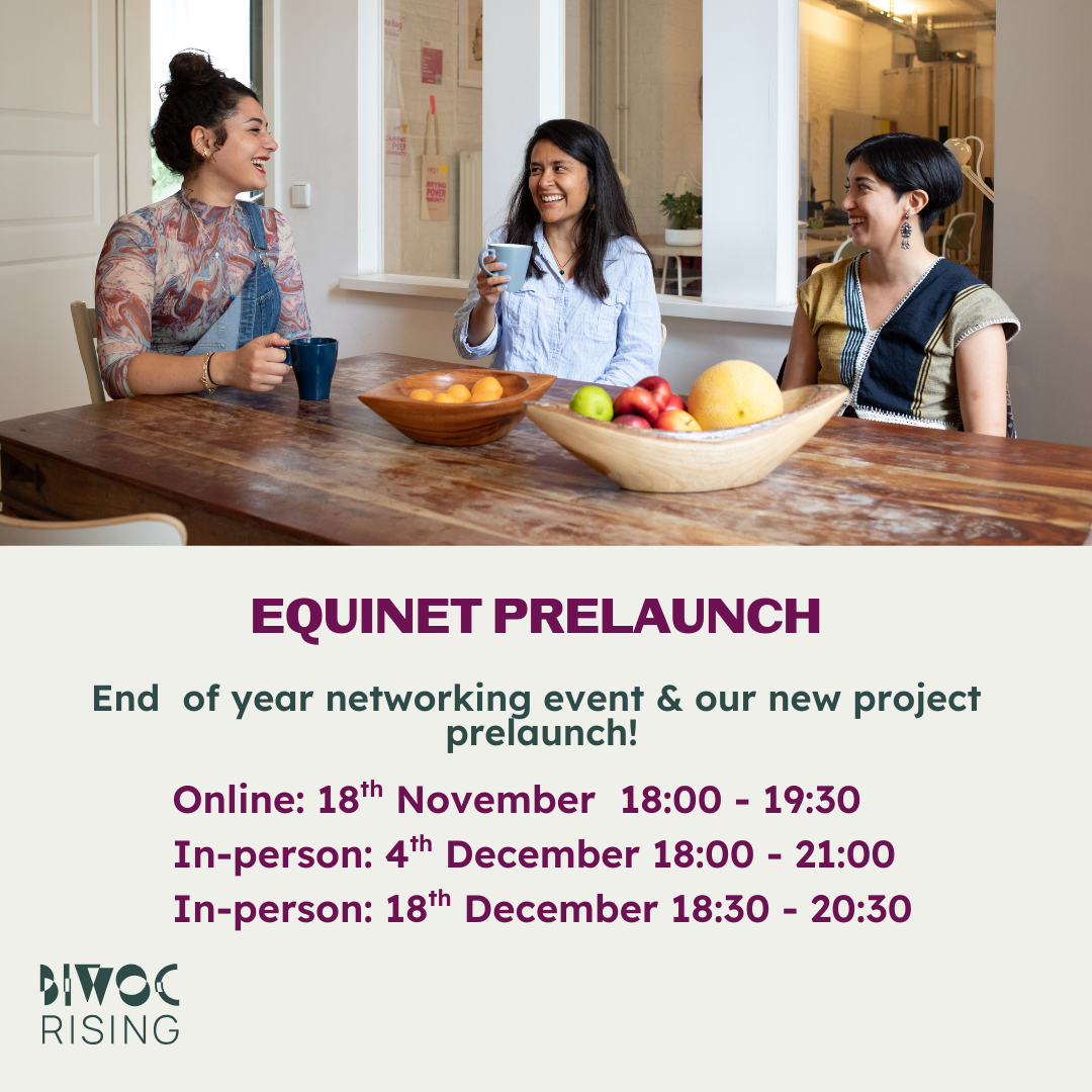 Let’s network for equality – ending the year connected and empowered! Economic exclusion is real, and many of us have experienced it this year. Whether you’re a migrant or BIPOC entrepreneur, founder, freelancer, artist, or just starting out, we want to hear your needs and concerns. Our new project EquiNet calls for more justice by empowering entrepreneurs from marginalized communities, helping businesses to turn diversity, equity, and inclusion (DEI) into action. Before our official launch in early 2026, join us for our End-of-Year Networking Event: Online: Tuesday, 18 November | 18:00–19:30 In Person: Thursday, 4 December | 18:00–21:00 | BIWOC* Rising Workspace In-person: 18th December 18:30 - 20:30 EquiNet Let’s gather, chat, and connect with like-minded changemakers to promote equality and diversify business ecosystems! ***